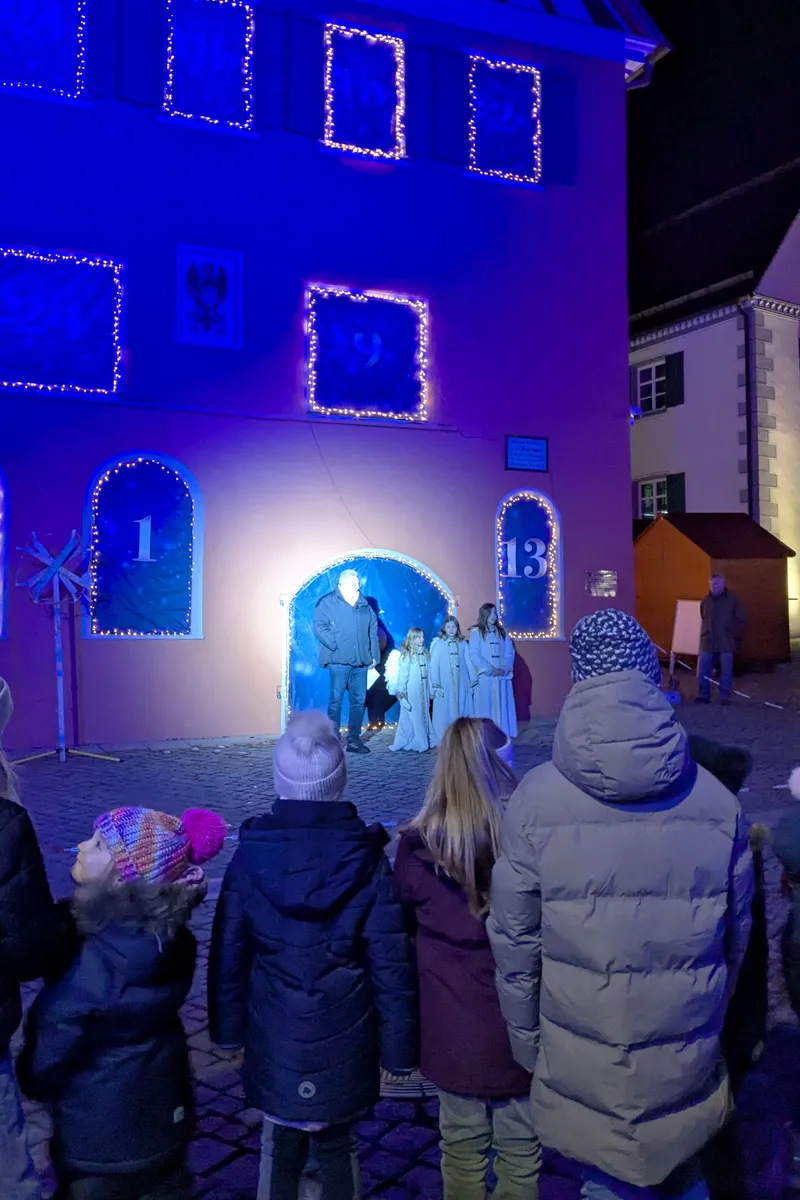Feierlich eröffneten die Engel Matilda Ladenburger, Emilia Rechtenbacher und Leonie Walpertinger das Adventstürchen. Alle Anwesenden genossen die zauberhafte Atmosphäre auf dem Marktplatz.