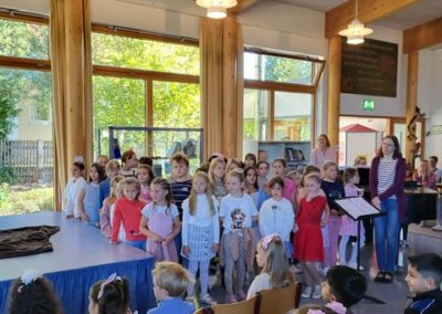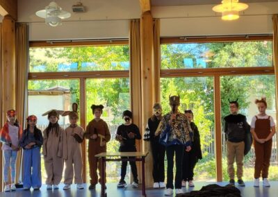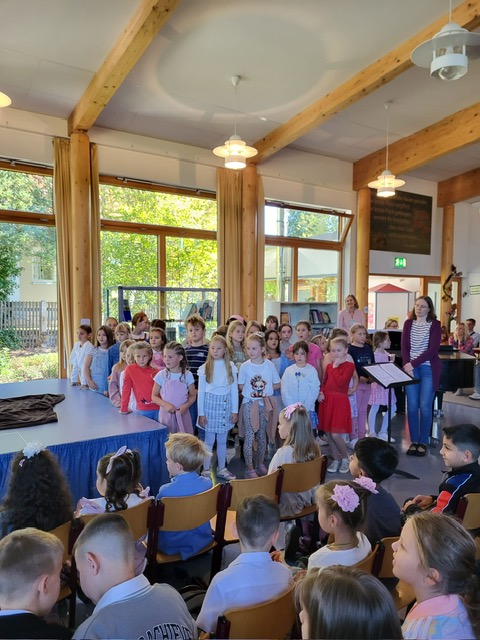 Anschließend gestalteten die Kinder der höheren Klassen ein buntes Programm. Zum Thema „Team“ präsentierten Theater-AG und Chor ein abwechslungsreiches Stück, indem die individuellen Stärken verschiedener Tiere schließlich zum Erfolg führten. Fuchs und Koala begleiteten anschließend die Erstklässler, die schon aufgeregt auf ihre erste Unterrichtstunde warteten, als Maskottchen in ihre Klassenzimmer. Währenddessen wurden die Familien von Eltern aus den Klassen 4 mit Kaffee und Kuchen bewirtet – herzlichen Dank auch an dieser Stelle an die fleißigen Helfer!