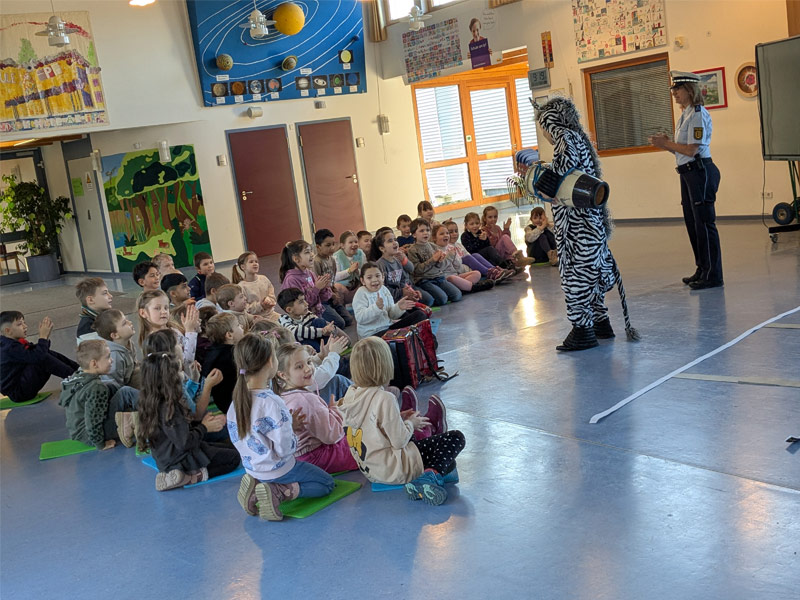 Die Erstklässler bekamen heute Besuch vom kleinen Zebra der Straßenverkehrsschule. Es hatte sich verirrt und wandte sich hilfesuchend an die Polizei. Gemeinsam mit dem kleinen Zebra lernten die Erstklässler das richtige Verhalten im Straßenverkehr. Sie übten das sichere Überqueren der Straße und das richtige Verhalten an der Fußgängerampel. Mit viel Freude wurden die Kinder so für mehr Sicherheit auf dem Schulweg sensibilisiert.