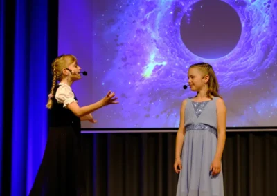 Mit sehr viel Begeisterung und Spielfreude brachten die 34 Kinder der Musical-AG der Grundschule am Ipf dieses anspruchsvolle Musical von Rolf Zuckowski, Wolfram Eicke und Hans Niehaus auf die Bühne der in ein Sternenreich verwandelten Jahnturnhalle. Mutig und souverän sangen die Kinder lange Solopassagen und präsentierten, was sie seit den Sommerferien einstudiert hatten.