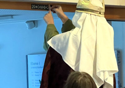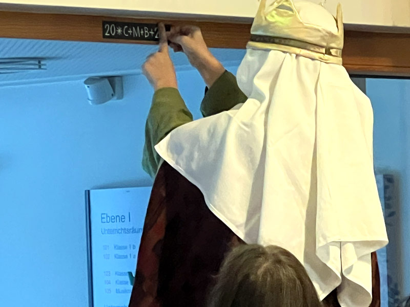 In diesem Jahr besuchten die Sternsinger unsere Schule und überbrachten den Segen für das Jahr 2026. Frau Breitenbücher erklärte den Schülerinnen und Schülern Bedeutung und Herkunft des Segensspruchs. Dieser wurde anschließend von den Sternsingern an der Eingangstür der Schule angebracht.